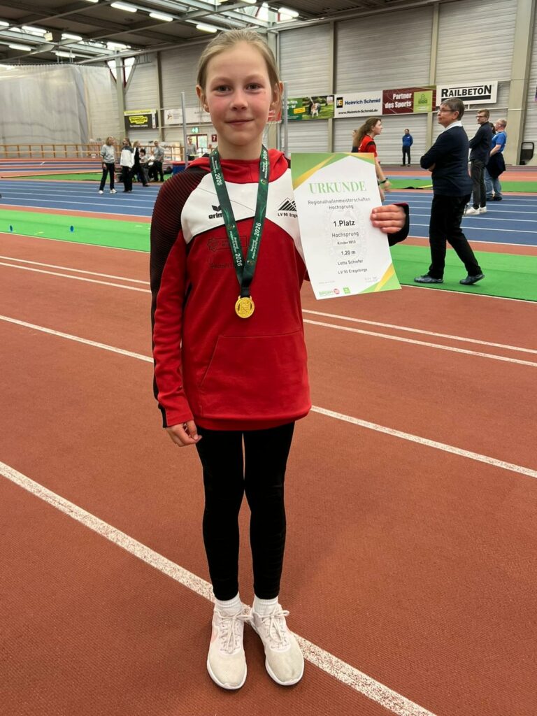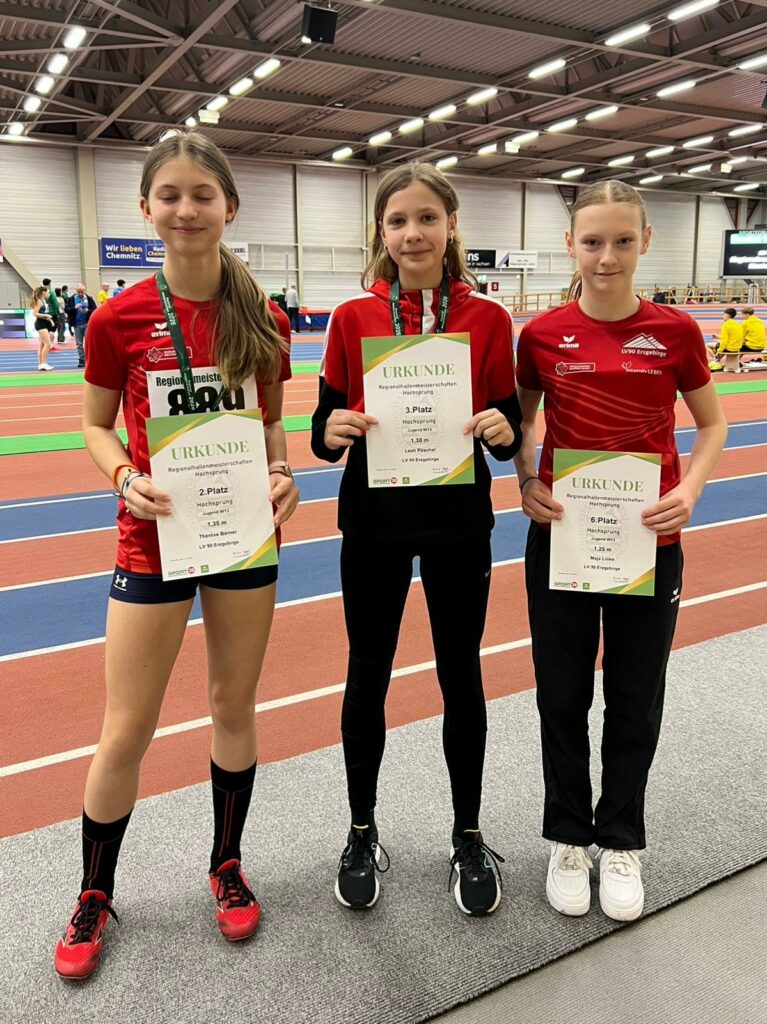 Bei den bereits am 27.03.2026 ausgetragenen Regionalhallenmeisterschaften der U12 – U16 im Hochsprung gelang den Schülern des LV 90 Erzgebirge mit fünf Titeln und weiteren fünf Podestplätze ein überaus erfolgreiches Abschneiden. Beim letzten Wettkampf der diesjährigen Hallensaison konnten in Chemnitz vor allem Gerrit Rische (M14) mit 1,60 m und Maira Schiller (W11) mit 1,35 m bei ihren Siegen mit starken Leistungen überzeugen. Weiterhin wurden Ida Simon (W12/1,30 m), Liam Schlegel (M10/1,15 m) und Lotta Schiefer (W10/1,20 m) neue Regionalmeister bzw. Regionalmeisterinnen. Silber ging an Emma Bartl (W15/1,35 m), Therese Börner (W13/1,35 m), Tristan Pönitz (M11/1,32 m) und an Daria Roucka (W11/1,23m). Bronze ersprang Leah Pöschel (W13/1,30 m).