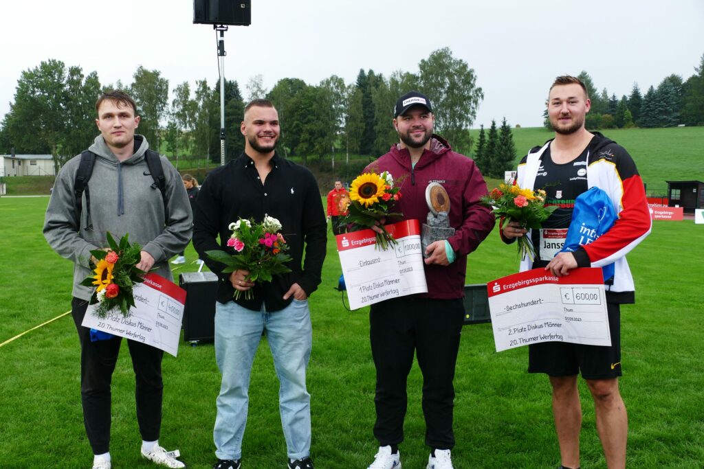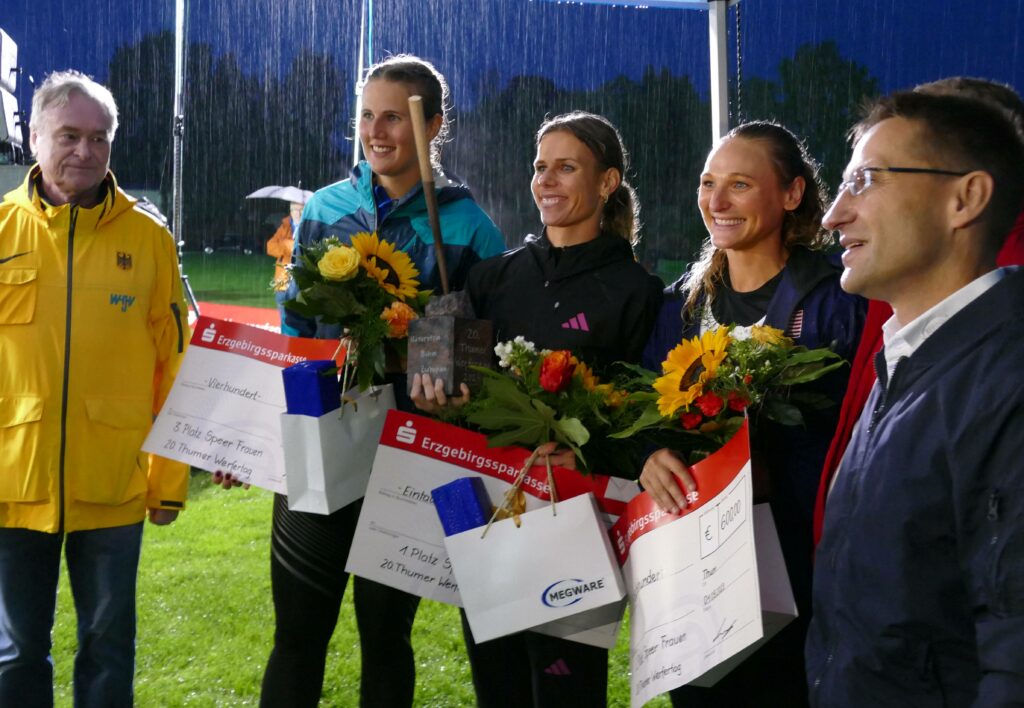 Im Kugelstoßring ging der Pokal der Frauen an die Portugiesin Auriol Dongmo Auriol, die mit 19,26 Metern die Vizeweltmeisterin Sarah Mitton (18,86 m) auf Platz 2 verwies. Damit revanchierte sich Dongmo für die WM in Budapest, wo sie das Podest als Vierte hauchzart verpasst hatte. Dabei ließ sich die Siegerin auch vom nunmehr teils strömenden Regen nicht abhalten – ähnlich wie Tom Walsh aus Neuseeland, der die männliche Konkurrenz mit 21,40 Metern dominierte. Da hatten auch der Tscheche Tomas Stanek (20,97 m) und der Brite Lincoln Scott (20,94 m) keine Chance. Trotz des Wetters wurden damit ordentliche Leistungen geboten, sodass sich Organisator Sven Lang hinterher zufrieden zeigte: „Ich hätte natürlich lieber blauen Himmel und Sonnenschein gehabt. Aber ich denke, den Athleten hat es trotzdem Spaß gemacht. Und wir konnten dem Publikum wieder gute Wettkämpfe bieten.“ Und emotional wurde es an diesem Abend auch. Nämlich dann, als die beiden Diskus-Experten Henning Prüfer und Korbinian Häßler ihre Laufbahn offiziell beendeten. Der 20. Thumer Werfertag war für sie ein würdiger Abschied.
