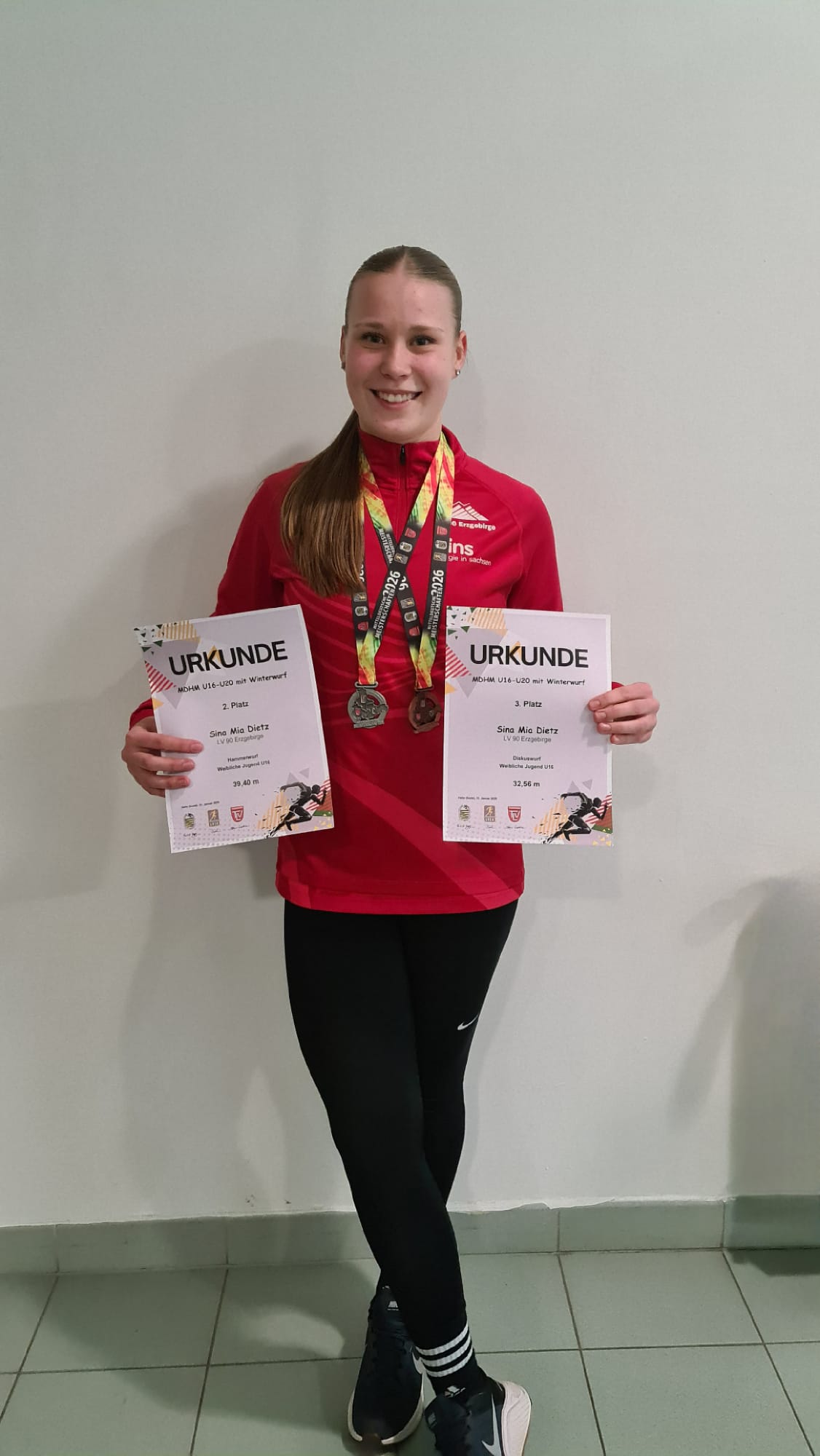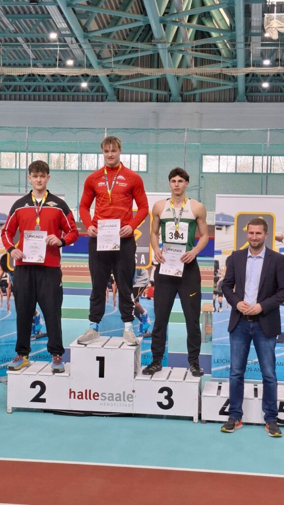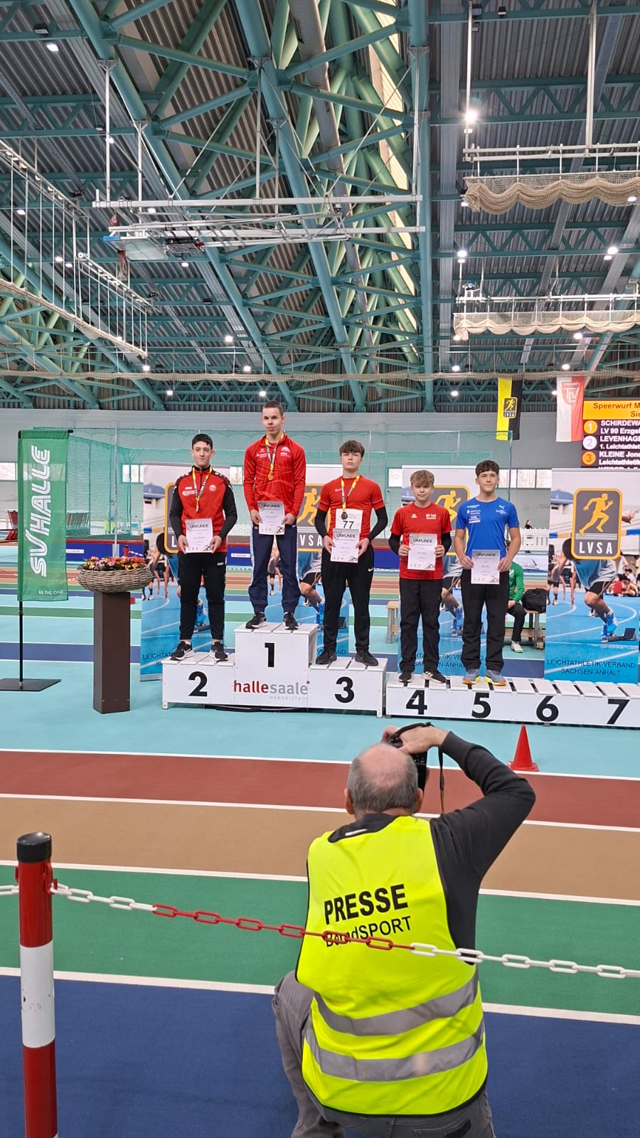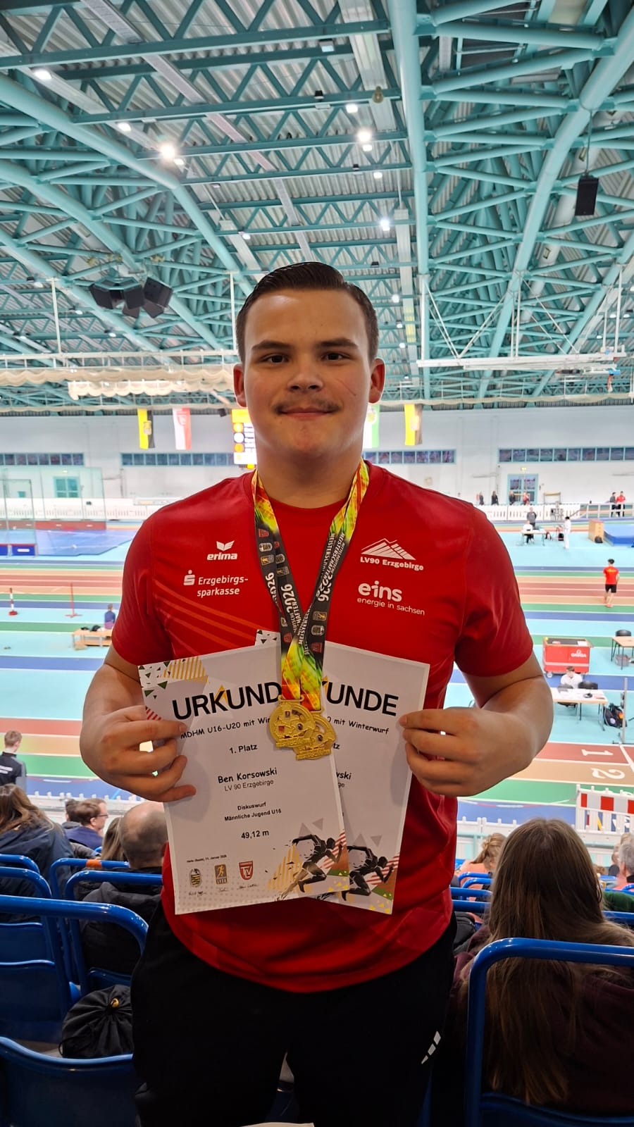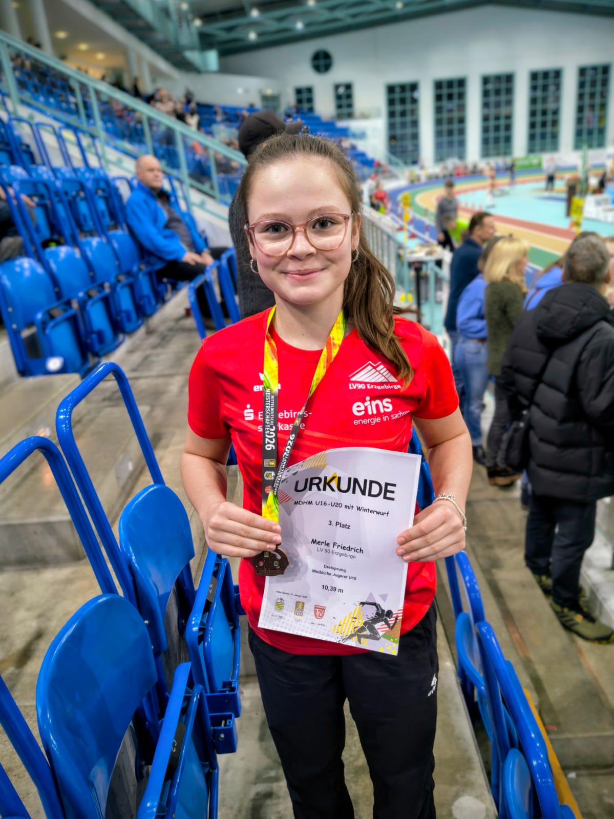 So erfolgreich wie schon lange nicht mehr schnitten die Jugendlichen des LV 90 Erzgebirge bei den Mitteldeutschen Hallenmeisterschaften in Halle/S. ab. Dabei wurden zehn Gold- sowie jeweils vier Silber- und Bronzemedaillen erkämpft. Max Louis Emmrich (mU20) siegte im Kugelstoßen mit 17,70 m und im Diskuswerfen mit 54,47 m. Ebenfalls einen Doppelsieg schaffte Ben Korsowski mit 49,12 m im Diskuswerfen und 45,69 m mit dem Hammer. Mit einer beachtlichen Leistung von 54,23 m siegte Robby Schirdewahn im Speerwerfen der mU16. Weitere Mitteldeutsche Meister wurden Elias Philemon Süß (mU18-Hammer 56,06 m/PB); Rike Brandl (wU20-Hammer 47,90 m/PB); Emilia Aurich (wU20-Stab 2,80 m); Pauline Schubert (wU18-Kugel 13,50 m) und die 4x200m-Staffel der wU18 (Nauke, Mynett, Netwall, Werner). Silber ging an Mia Josephine Fritz (wU20-Kugel 12,34 m); Ben Korsowski (mU16-Kugel 15,26 m); Amilia Seidel (wU16-60m 7,85 sec) und Sina Mia Dietz (wU16-Hammer 39,40 m). Bronze erkämpften Julius Stütz (mU18-Weit 6,83 m); Merle Roßner (wU18-Kugel 13,27 m); Merle Friedrich (wU16-Drei 10,39 m) und Sina Mia Dietz (wU16-Diskus 32,56 m).
